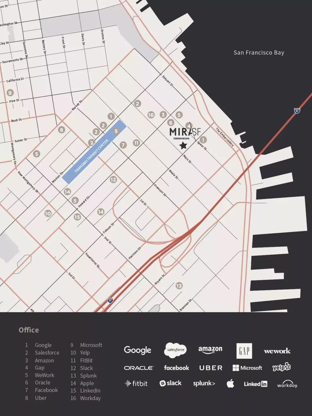 以Transbay Center 的中央交通枢纽与为中心,2007年旧金山政府启动了SOMA区的10-15年规划。这是一个旧金山市自2015年来最大的集中规划开发,结合A级写字楼和高端住宅和出租类公寓、公园,横跨3个街区的Transbay Center 中央交通枢纽,商业的综合开发。